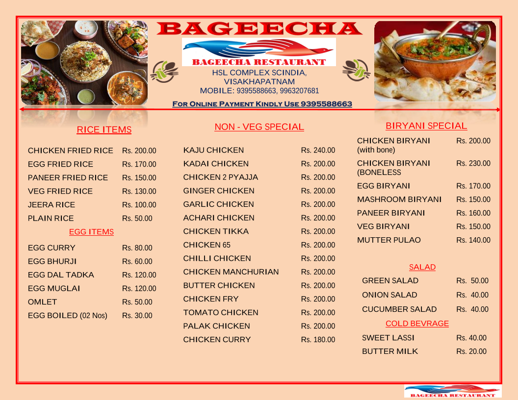 Welcome to Bageecha Restaurant, a hidden gem nestled in the HSL Complex of Visakhapatnam. This quaint eatery serves up a delightful array of both vegetarian and non-vegetarian dishes, available from morning until 11 PM. Renowned for its delicious Aloo Paratha paired with refreshing Raita, the restaurant promises a culinary adventure that captures the essence of diverse regional flavors.